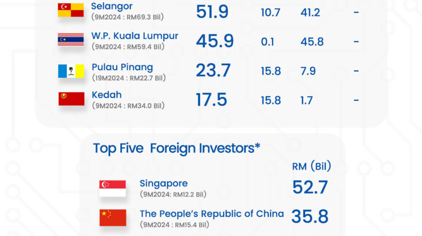 Johor recorded the highest value of approved investments (RM91.1 billion), followed by Selangor (RM51.9 billion), W.P. Kuala Lumpur (RM45.9 billion), Pulau Pinang (RM23.7 billion) and Kedah (RM17.5 billion). Johor’s dominance is largely attributed to the Johor-Singapore Special Economic Zone (JS-SEZ) and its proximity to one of Asia’s most advanced economies.